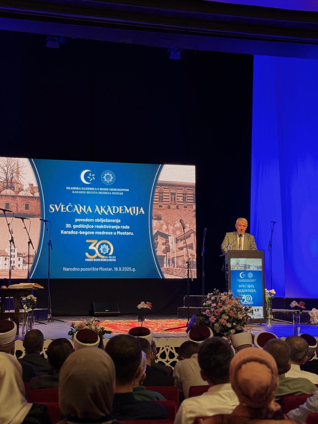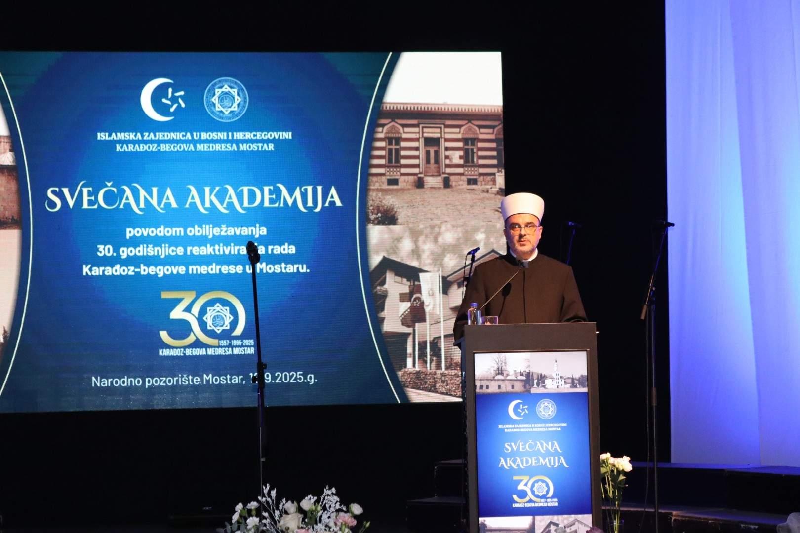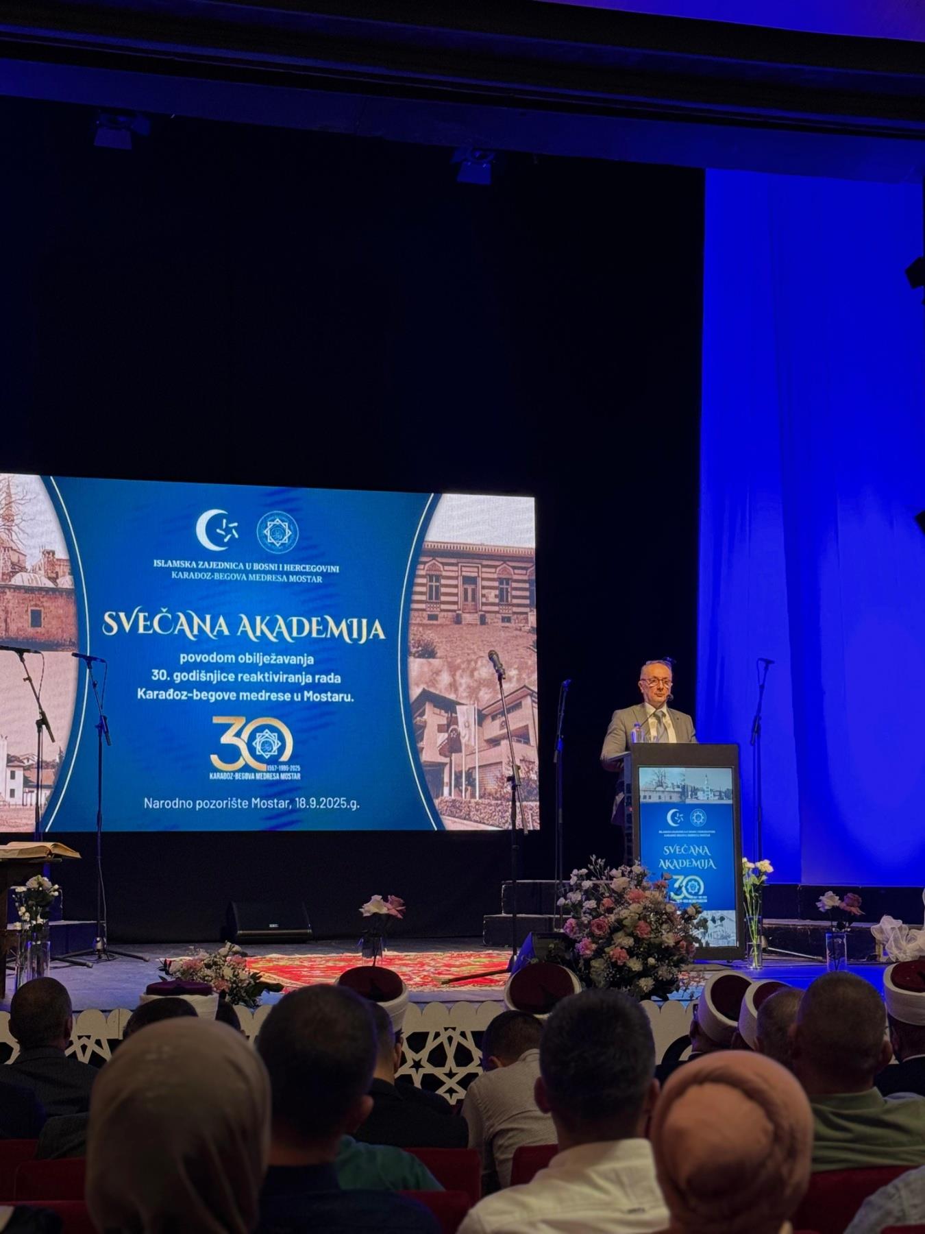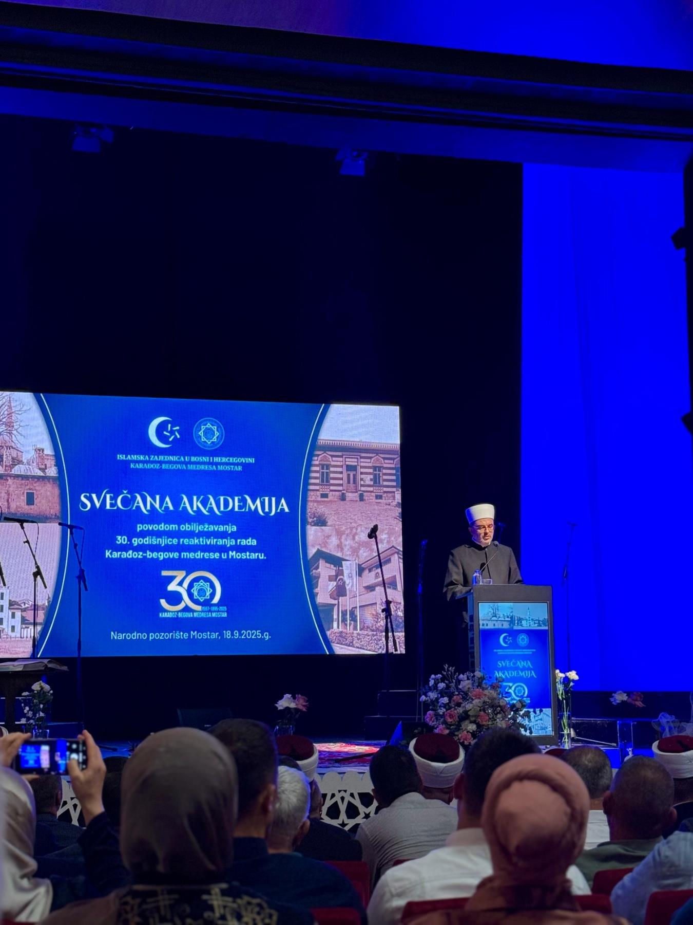 Svečana akademija povodom 30. godišnjice reaktiviranja rada Karađoz-begove medrese i obilježavanja 468 godina od osnivanja ove druge po starini odgojno-obrazovne institucije u Bosni i Hercegovini održana je 18. septembra 2025. godine u Narodnom pozorištu Mostar.