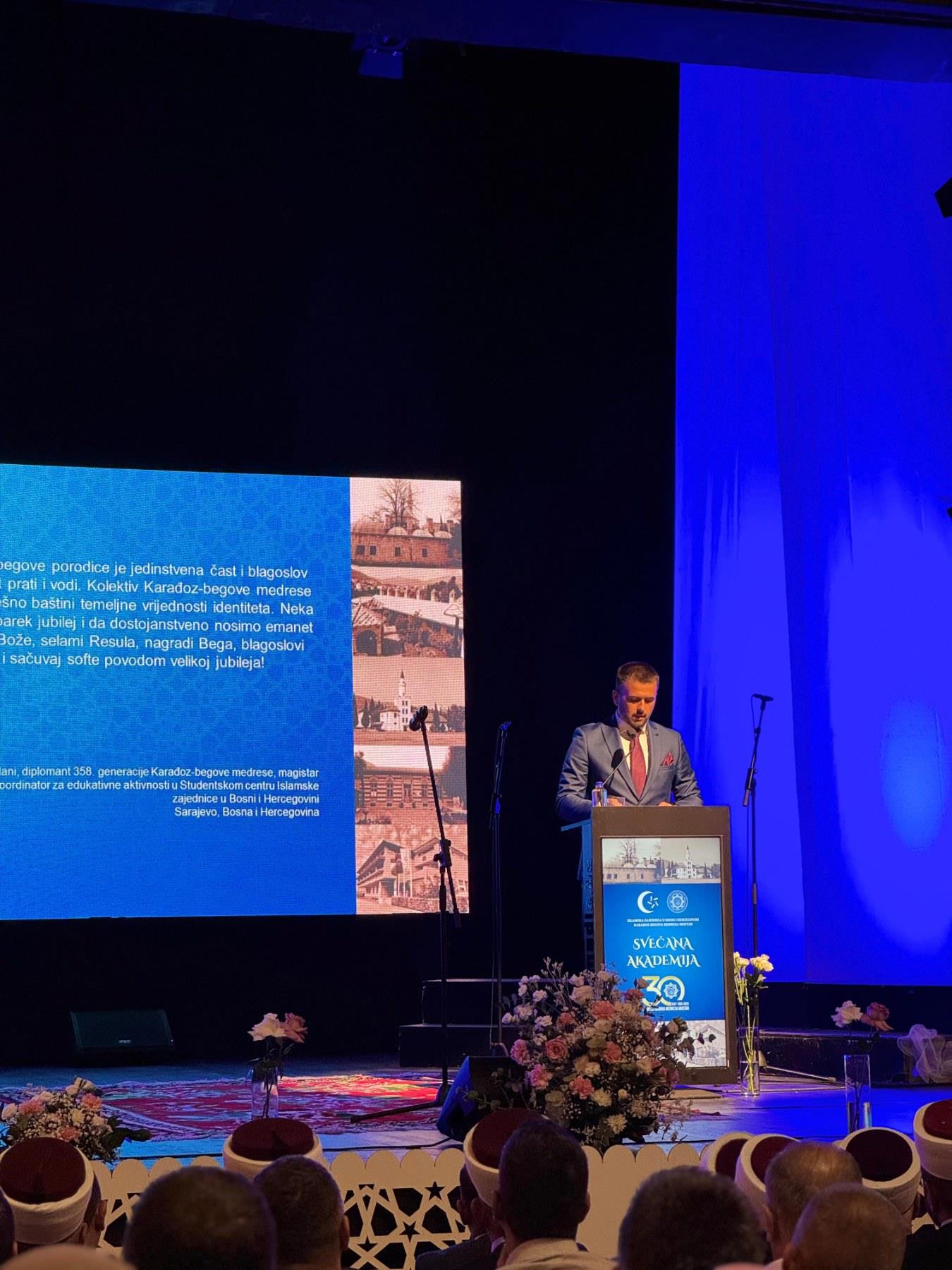 „Najveći doprinos ostvarili smo na vjerskom planu, što su prepoznali naši džemati, medžlisi i druge institucije Islamske zajednice. Ovo je zaista veliki jubilej, jubilej rada, truda, znanja, duhovnosti, solidarnosti i prijateljstva“ - rekao je mr. hfz. Aid Tulek, direktor Karađoz-begove medrese, u uvodnom obraćanju i izrazima dobrodošlice na Svečanu akademiju.