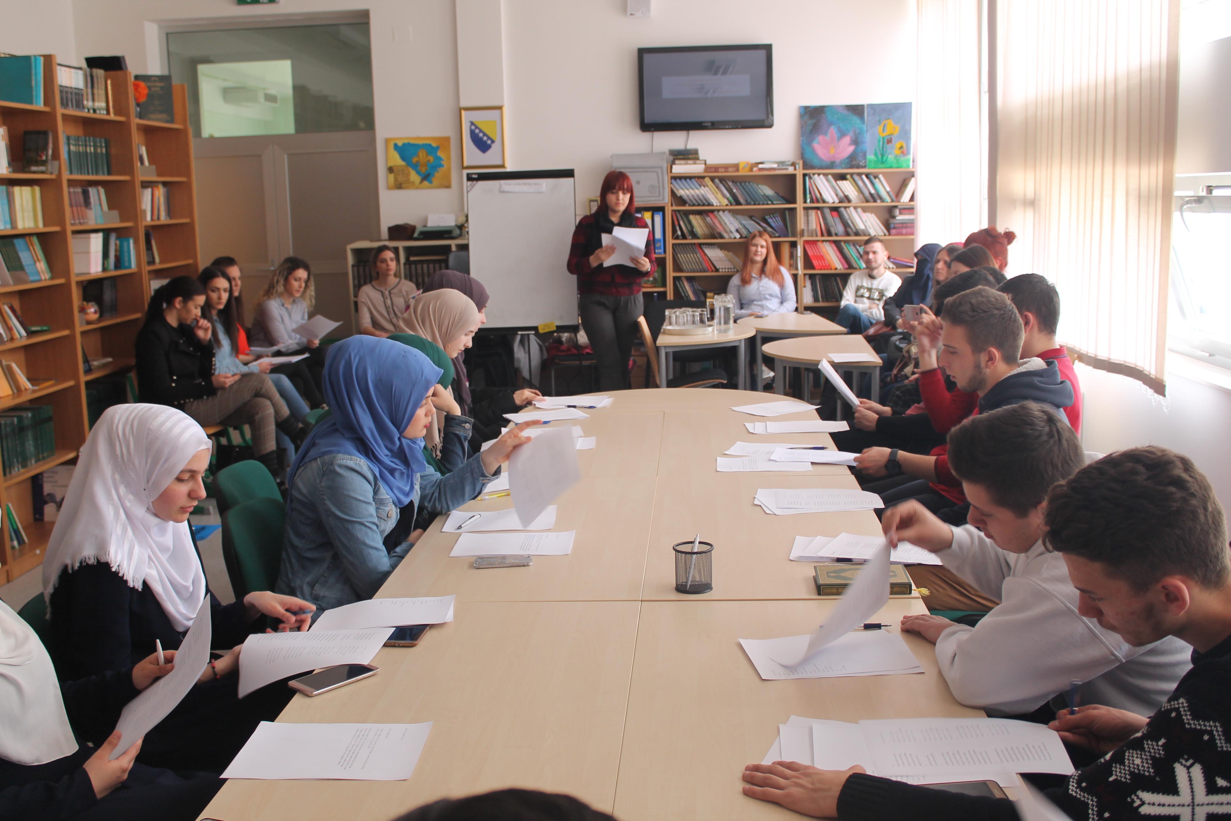 Naime, organizovana je radionica za učenike naše škole, a koju su održali studenti četvrte godine Odsjeka za bosanski jezik i književnost Fakulteta humanističkih nauka Univerziteta „Džemal Bijedić“, predvođeni svojim profesoricama dr. sc. Irmom Marić i dr. sc. Sanjom Merzić.