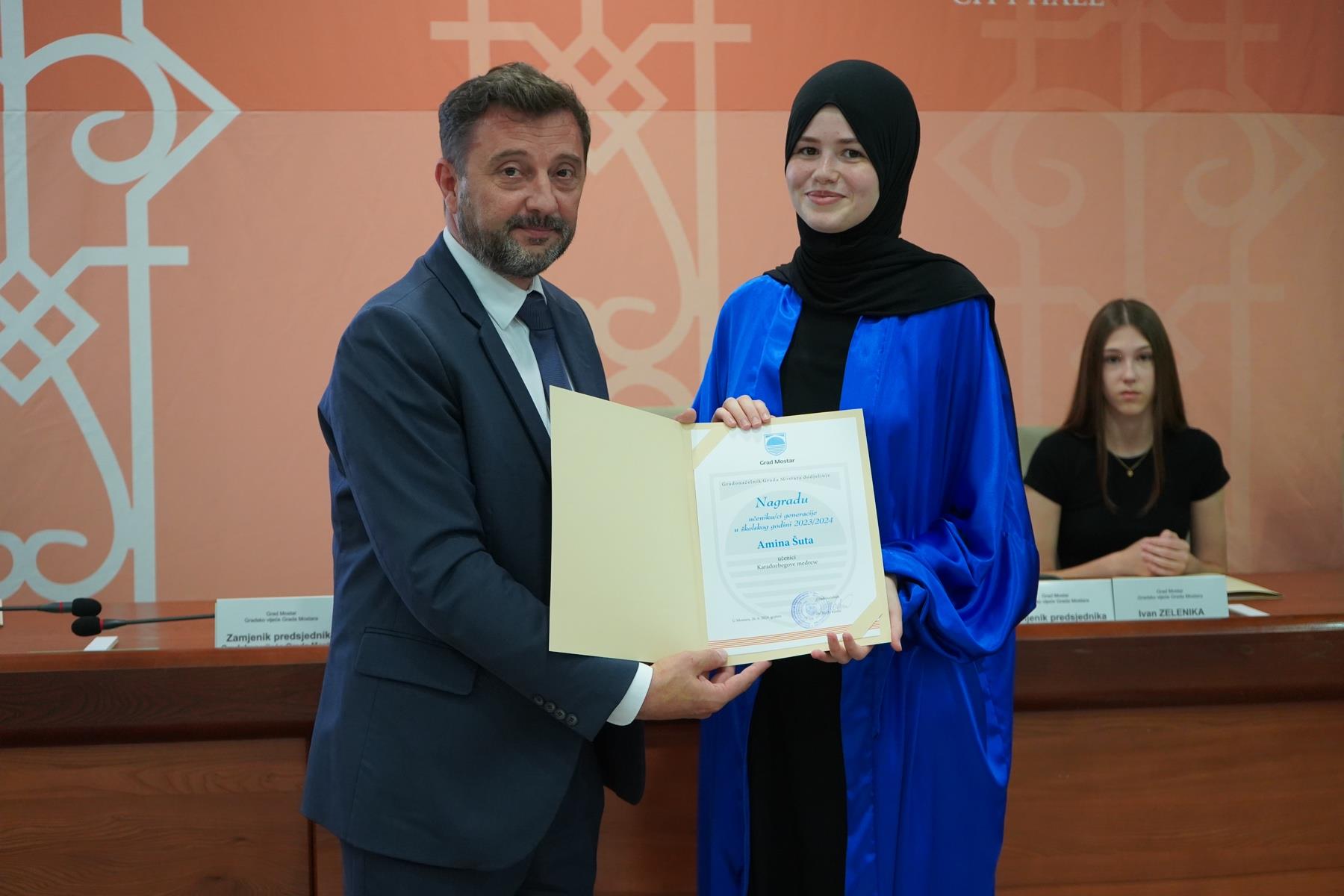 Nagrade je uručio gradonačelnik Mario Kordić, a dodjela nagrada upriličena je u Vijećnici Grada Mostara. Nagrade su kao Učenik i Učenica generacije Karađoz-begove medrese za školsku 2023/2024. godinu dobili Ahmed Delić i Amina Šuta.