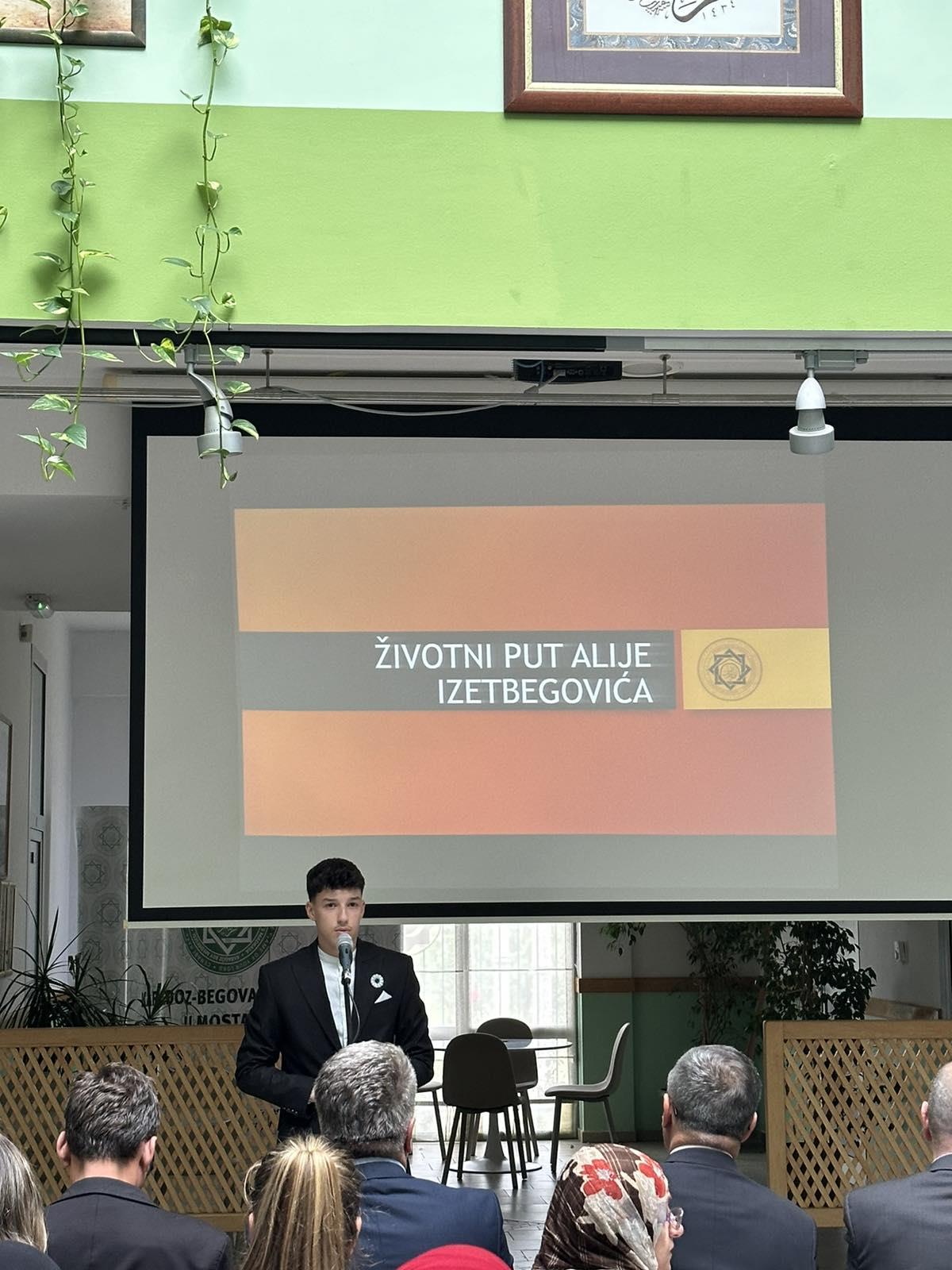 Kroz program su učenici podsjetili na lik i djelo rah. Alije Izetbegovića, te podstakli na razmišljanje sve prisutne o onome što je govorio prvi predsjednik Republike Bosne i Hercegovine. Istakli su i biografske podatke iz života rah. Alije Izetbegovića, te ono što su drugi govorili o našem prvom predsjedniku.