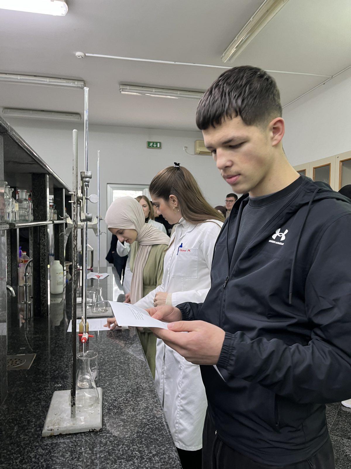 Domaćini našim učenicima bili su mr. Dženita Alibegić, viši asistent na Nastavničkom fakultetu Univerziteta „Džemal Bijedić“ i mr. Chiara Marino, također asistent na navedenom fakultetu. Magistrice Alibegić i Marino upoznale su učenike sa mjereama zaštite pri radu u laboratoriji i sa laboratorijskim priborom, te su učenici imali priliku prisustvovati vježbama titracije, vaganja i mjerenja pH vrijednosti.